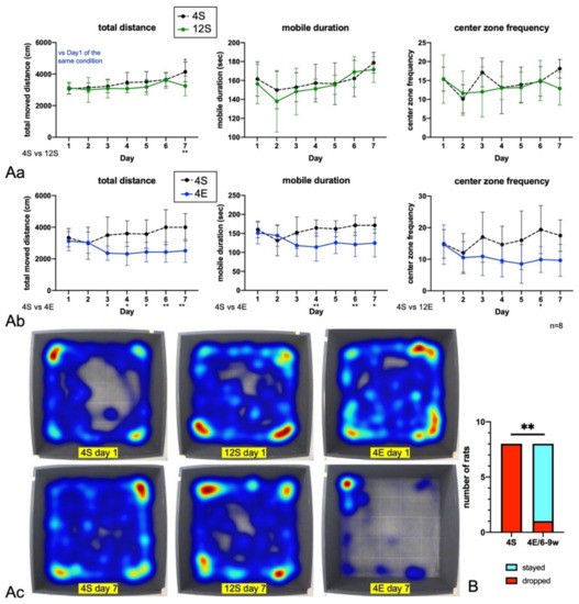 Day OF test data of LHRs of Batches 2, 3, and 4 (n = 8). (A) (Aa) The behaviors of the 4S and 12S LHRs were almost the same throughout the 7-day OF test. (Ab) The 4E rats were less active than the 4S ones. (Ac) Representative heatmaps of the OF test for each group. On day 7, only the 4E rats exhibited decreased activity. Two-way ANOVA with Tukey’s multiple comparison test. (B) The drop test showed that the 4E/6–9w LHRs were more attentive than the 4S control rats. χ2 test and Fisher’s exact test. (C) The 7-day OF test showed that the 4E/6–9w LHRs had a less active nature compared with the 4S rats. The results of tests were analyzed with two-way ANOVA with Tukey’s multiple comparison test. The single, double, triple, and quadruple asterisks in the graphs indicate statistical significance at p < 0.05, 0.01, 0.001, and 0.0001.