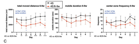 Whether ADHD-like behaviors improve when rats are reared in an EE with four rats after 6 weeks of age (4E/6–9w), which corresponds to the adolescence period, was also examined (Batch 4, Figure 1C). PND23 is considered to correspond to early childhood, but diagnosis of ADHD in such early childhood is usually difficult [40]. Therefore, rearing in EE was initiated from PND42 was carried out and the effects on rats’ behaviors were examined whether growing in EE could be a realistic therapeutic intervention. Eight rats from the 4E/6–9w and 4S groups were subjected to a drop test (Figure 3B) and OF test for 7 consecutive days (Figure 3C). In the drop test, all rats in the 4S group fell, whereas only one rat in the 4E/6–9w group did. The OF test showed that the total moved distance, mobile duration, and number of entries into the center zone decreased in the 4E/6–9w rats compared with the 4S ones.