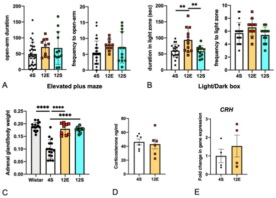 Behavioral test data (EPM and L/D box tests) of the 4S, 12E, and 12S rats of Batches 1 and 2, and weights of the adrenal glands, plasma corticosterone levels, CRH mRNA expression in the hypothalamus. (A) The EPM test did not produce significant results for the 4S (n = 30), 12E (n = 10), and 12S (n = 12) groups. One-way ANOVA with Tukey’s multiple comparison test. (B) L/D box test. The 12E rats (n = 12) remained longer in the light chamber than did the 4S (n = 20) and 12S (n = 12) rats. One-way ANOVA with Tukey’s multiple comparison test. (C) The adrenal gland weight (milligrams)/body weight (grams) ratio of the 4S LHRs (n = 24) was lower than the ratios of the other groups. Wistar rats (n = 10) reared in the 4S condition had larger adrenal glands compared with the 4S LHRs. The 12E (n = 9) and 12S (n = 12) LHRs had almost the same weight of adrenal glands. ANOVA with Tukey’s multiple comparison test. (D) The plasma corticosterone levels of the 4S and 12E LHRs (n = 6) were almost the same. Unpaired two-tailed t test. (E) The CRH mRNA level in the hypothalamus of 12E LHRs and the 4S ones. One-way ANOVA with Tukey’s multiple comparison test, n = 4. The double and quadruple asterisks in the graphs indicate statistical significance at p < 0.01 and 0.0001.