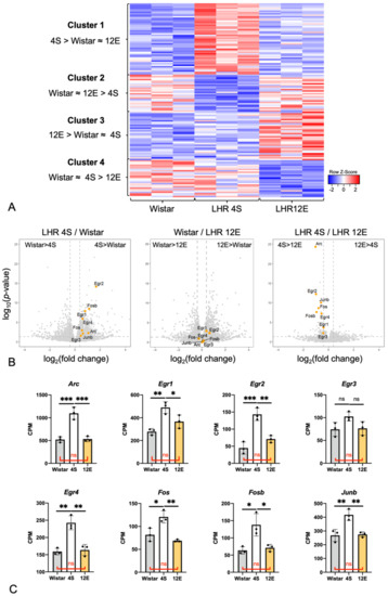 Gene expression in the PrL of Wistar rats, 4S LHRs, and 12E LHRs (n = 3, each) was investigated with RNAseq. (A) Hierarchical clustering of gene expression of the three groups. Cluster 1 is the one expressed more strongly by the 4S LHRs relative to the other two groups. (B) Volcano plot analysis showed stronger expression of IEGs, including Fos, Egr2, and Arc, in the 4S and 12E LHRs compared with the Wistar rats. The 12E LHRs and Wistar rats demonstrated nearly the same levels of IEG expression. (C) 4S LHRs expressed Arc, Egr1, Egr2, Egr4, Fos, Fosb, and Junb, at higher levels than Wistar rats and 12E LHRs. One-way ANOVA with Tukey’s multiple comparison test. Genes belonging to each cluster are listed in Supplementary Table S1. The single, double, and triple asterisks in the graphs indicate statistical significance at p < 0.05, 0.01, and 0.001.