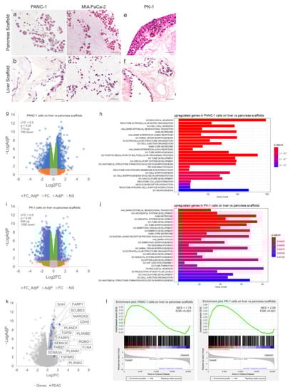 Tissue-specific properties of human decellularized scaffolds for PDAC cultures. H&E staining of PDAC cells cultured for 14 days on decellularized scaffolds showed (a) PANC-1 cells on pancreas scaffolds migrated into the ECM and (b) PANC-1 cells on liver scaffolds only attached on the edge of the ECM with no migration inward. (c) MIA PaCa-2 cells on pancreas scaffolds migrated into the ECM and (d) MIA PaCa-2 cells on liver scaffolds also migrated into the ECM. (e) PK-1 cells on pancreas scaffolds grew into thick clusters on the edge of the ECM and (f) PK-1 cells on liver scaffolds invaded the vessels and migrated into the ECM as thick clusters. Volcano plot visualizing the gross gene expression changes as determined by RNAseq comparing (g) PANC-1 cells on liver scaffolds versus pancreas scaffolds and (i) PK-1 cells on liver scaffolds versus pancreas scaffolds. Genes that showed significantly altered expression (LFC > 0.5, p < 0.05) are indicated in blue. Functional enrichment analysis of the differentially overexpressed genes with the lowest adjusted p-values between cells cultured on liver and pancreatic scaffolds is shown, (h,j) depict the results for PANC-1 and PK-1 cells, respectively. Bar length is analogous to the number of differentially expressed genes in the functional annotation category, while the bar color depicts the adjusted p-value for the hypergeometric test performed. (k) Volcano plot visualizing the gene expression changes as determined by RNAseq comparing PANC-1 cells on liver scaffolds versus pancreas scaffolds with significantly overexpressed genes (LFC > 0.5, p < 0.05) known to play a role in pancreatic cancer and metastasis highlighted. (l) GSEA plots showing enrichment of upregulated genes on liver versus pancreas scaffolds in basal compared to classical Moffit PDAC subtypes from the TCGA. NES, normalized enrichment score; FDR, false discovery rate. Scale bars for (a–f) are 50 µm. (n = 8 per condition for (a–f)), and (n = 3 per condition (g–l)).