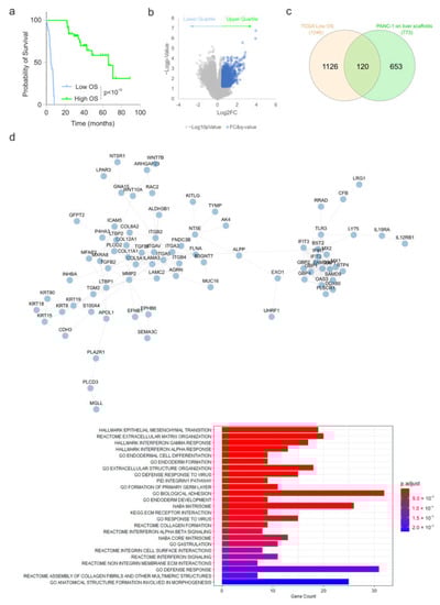 Identification of genes induced in PANC1 cells on liver scaffolds and those associated with clinically aggressive PDAC. (a) Overall survival (OS) of the upper and lower quartiles of 184 PDAC patients from the TCGA PanCancer Atlas (cBioPortal). (b) Volcano plot of gene expression for patient tumours in the upper and lower quartiles for overall survival from (a). Genes highlighted in blue indicate those showing significantly increased expression (LFC > 0.5, q-value < 0.25). (c) Overlap analysis of genes increased in PANC-1 cells on the liver scaffold compared to the pancreas scaffold and those increased in the tumours of patients displaying poor survival. (d) STRING interaction network for the 120 genes identified in the overlap analysis. Functional enrichment analysis of the 120 genes identified in the overlap analysis is presented. Bar length is analogous to the number of differentially expressed genes in the functional annotation category, while the bar color depicts the adjusted p-value for the hypergeometric test performed.