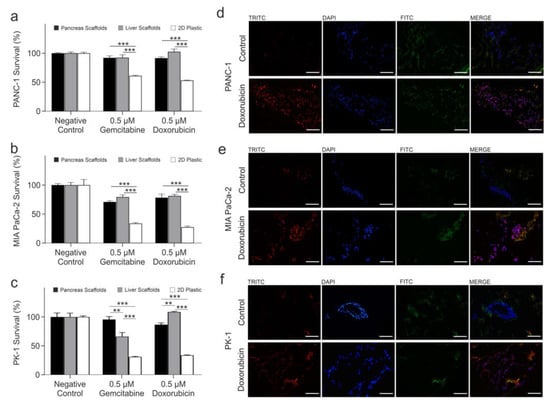 To prove that chemotherapy drugs were able to reach and be taken up by the cells growing into the scaffolds, detection of the natural fluorescence of doxorubicin was utilized. PANC-1, MIA PaCa-2 and PK-1 cells cultured on pancreas scaffolds were treated with 1 µM doxorubicin for 24 h. The samples were then directly frozen and cryo-sectioned. As a control, untreated samples were also imaged. Control PANC-1 (Figure 4d top panel), MIA PaCa-2 (Figure 4e; top panel) and PK-1 (Figure 4f; top panel) samples did not present any fluorescence in the doxorubicin channel (TRITC; red) but did present a positive signal for nuclei (DAPI; blue) and collagen (FITC; green). On the other hand, in all the treated samples, PANC-1 (Figure 4d; bottom panel), MIA PaCa-2 (Figure 4e; bottom panel) and PK-1 (Figure 4f; bottom panel) doxorubicin fluorescence (TRITC; red) was detected, and nuclei (DAPI; blue) and collagen (FITC, green) were observed as well. When the three channels were merged, it was evident that doxorubicin had reached the nuclei in the 3 cell types employed (MERGE; purple).