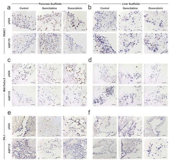 MIA PaCa-2 cells on pancreas scaffolds did not express γH2A in the control samples but were positive in gemcitabine-and doxorubicin-treated samples (Figure 5c; top panel). ASP175 staining was negative in the control samples, and in the majority of cells when treated with gemcitabine and doxorubicin (Figure 5c; bottom panel). MIA PaCa-2 cells on liver scaffolds did not express γH2A (Figure 5d; top panel) and ASP175 (Figure 5d; bottom panel) in any of the tested conditions: control, gemcitabine or doxorubicin. Therefore, similar to the PANC-1 results, both chemotherapies caused DNA damage in the MIA PaCa-2 cells in pancreas scaffolds, but the cells managed to avoid apoptosis. Similar to the PANC-1 cells, the same chemotherapy approaches did not result in DNA damage and cell death of MIA PaCa-2 cells repopulating the liver scaffolds.