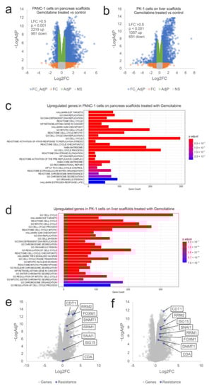 Transcriptional response of PANC-1 and PK-1 cells treated with gemcitabine on their native scaffolds. Volcano plots of (a) PANC-1 and (b) PK-1 cells treated with 0.5 µM gemcitabine on their native scaffolds. Blue symbols represent genes showing significantly altered expression (LFC > 0.5, p < 0.05). Functional analysis of the overexpressed genes identified in (c) PANC-1 and (d) PK-1 cells treated with gemcitabine. Expression of a panel of genes related to gemcitabine resistance in (e) PANC-1 and (f) PK-1 cells are indicated in blue. (n = 3 per condition).