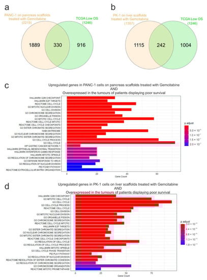 Overlap analysis of genes significantly induced by gemcitabine treatment and genes associated with low overall survival in pancreatic cancer patients. Venn diagrams to show the overlap of genes significantly overexpressed in (a) PANC-1 or (b) PK-1 cells following gemcitabine treatment and those increased in the tumours of patients displaying poor survival i.e., low overall survival (OS). Functional analysis of the genes identified in (c) PANC-1 and (d) PK-1 cells treated with gemcitabine and also found to be overexpressed in the tumours of patients displaying poor survival.
