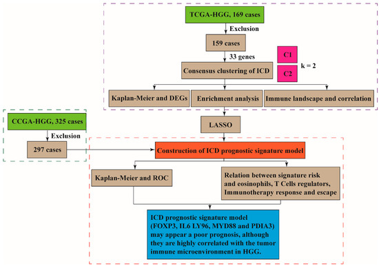 In the present study, we establish a new classification system and identify ICD prognostic indicator genes: FOXP3, IL6 LY96, MYD88 and PDIA3 that inform poor HGG patient prognosis. This study provides new perspectives and insights and serves as a reminder for HGG patients undergoing ICD-associated immunotherapy.
