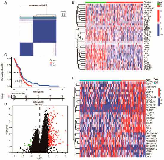 Given that the ICD signature in HGGs remains unclear, we performed bioinformatic analyses using the TCGA database to identify ICD gene metagene [17,18]. The workflow of the study is shown in Figure 1. The expression of these ICD-related genes (33 genes panel) in HGGs samples and the corresponding patient survival data were used in gene clustering. Clustering numbers (k) between two to nine were evaluated (Figure S1). The classification of glioma samples into two clusters showed an ideal clustering effect (Figure 2A). ICD-related genes were upregulated in Cluster 1 (C1) and were downregulated in Cluster 1 (C2) (Figure 2B). We also found that patients stratified into the C1 group had a worse survival in comparison with those stratified into the C2 group (Figure 2C). The differentially expressed genes (DEG) between the C1 and C2 groups were identified by ICD genotyping (Figure 2D,E).