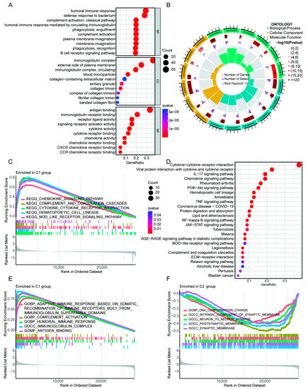 Enrichment analysis of DEGs in ICD genotyping of HGGs. (A,B) GO enrichment analysis in different ICD genotyping. (C) KEGG enrichment analysis in C1 group. (D) KEGG enrichment analysis in different ICD genotyping. (E,F) GO enrichment analysis in C1 and C2 groups, respectively.