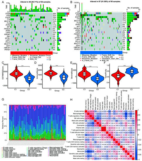 Comparison of somatic mutations, immune landscape and correlation in ICD genotyping of high-grade glioma. The top 20 most frequently mutated genes were oncoprint visualized in C1 (A) and C2 group (B). ESTMATES score (C), ImmuneScore (D), StromalScore (E), TumorPurity (F) in different ICD genotyping. (G) The immune cell composition of each glioma sample. (H) Correlation analysis of different immune cells in glioma samples (*** p < 0.001 vs. indicated group).