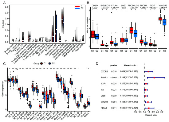 Comparison of TIME in ICD genotyping and revelation of the seven ICD genes with potential prognostic value. (A) Violin plot of immune cells in C1 and C2 group. Box plots of immune checkpoints (B) and HLA genes (C). (D) Univariate cox analysis for the prognostic value of the seven ICD genes according to OS. (* p < 0.05, ** p < 0.01 and *** p < 0.001 vs. indicated group, dots mean discrete value).