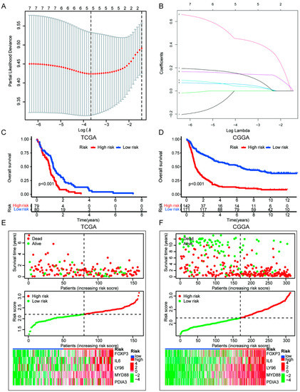 Construction and validation of the ICD risk signature in TCGA and CGGA database. (A,B) LASSO regression of the most associated genes with OS in TCGA. (C,D) Kaplan–Meier analyses in TCGA and CGGA databases. (E,F) Survival status, risk scores distribution, and heatmaps of five prognostic gene signatures of each patient in TCGA and CGGA.