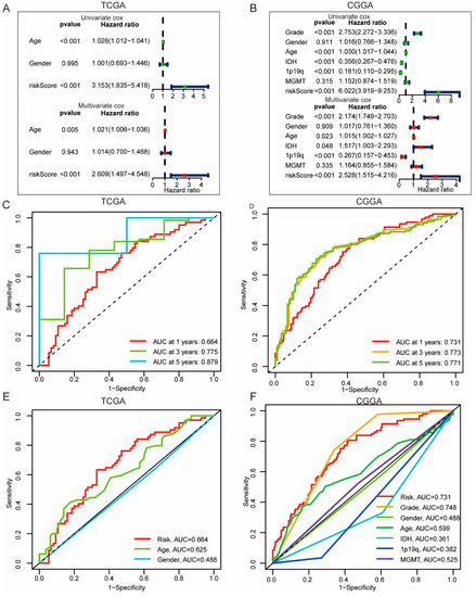 The prognostic value of ICD prognostic signature model in TCGA and CGGA database. The independent prognostic value of ICD risk signature by univariate and multivariate Cox analysis in TCGA (A) and CGGA (B) database. One-, three- and five-year ROC curves of prognostic value in TCGA (C) and CGGA (D) database. ROC curves of ICD prognostic risk score, age and grade in TCGA (E), and ICD prognostic risk score, age, grade pathological grade, IDH mutation, 1p19q co-deletion and MGMT methylation in CGGA (F) database.