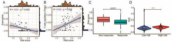 The prognostic value of ICD prognostic signature model and immunotherapy sensitivity. Correlation between ICD prognostic risk score with the content of eosinophils (A) and T Cells regulators (B). (C) Risk scores for the response to ICB immunotherapy in different patients. (D) Immunotherapy escape in different patients of ICD prognostic risk scores. (*** p < 0.001 vs. indicated group).