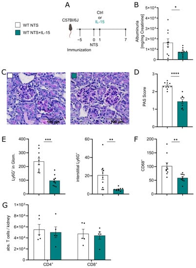 Since high doses of rIL-15 are known to stimulate CD8+ cytotoxic cell responses, we set out to study the effect of low-dose rIL-15 as an intervention in NTS. Mice were treated with a low dose of rIL-15, which has been shown to protect tubular epithelial cells in vitro [17], on day 1 of disease. Albuminuria, histological changes, and myeloid cell infiltration were analyzed on day 7 and compared to controls (experimental setup Figure 1A). In the group treated with rIL-15, albuminuria was reduced by 50% (Figure 1B) and histological analysis showed less glomerulosclerosis reflected by lower PAS scores (Figure 1C,D). Interestingly, whereas treatment reduced renal myeloid cell infiltration, represented by fewer Ly6G+ cells in glomeruli and the interstitium (Figure 1E) and fewer CD68+ cells (Figure 1F), no difference in overall CD3+CD4+ and CD3+CD8+ T cell numbers in kidney tissue were found (Figure 1G).