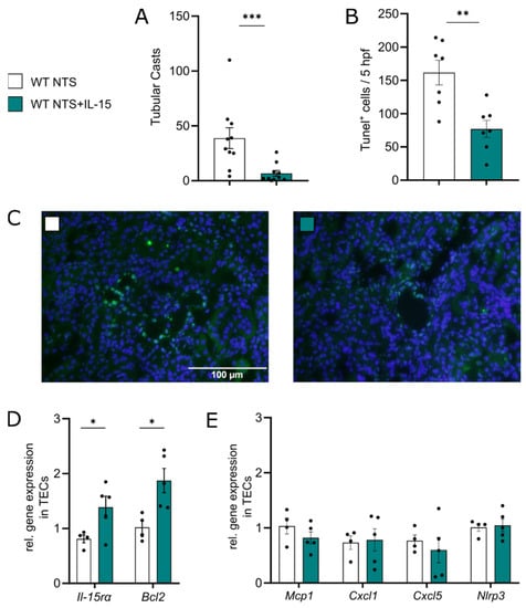 rIL-15 promotes TEC survival in NTS. Data represent day 7 of NTS. (A) Quantification of tubular cast formation in PAS-staining of kidney tissue. (B) Quantification of TUNEL+ cells in 5 hpfs and (C) representative micrographs (×40 magnification). (D) Relative gene expression of Il-15rα and Bcl2 and (E) Mcp1, Cxcl1, Cxcl5, and Nlrp3 in renal tubular epithelial cells. Data in A and B represent two independent experiments. Black dots represent individual values of respective mice. * p ≤ 0.05, ** p ≤ 0.01, *** p ≤ 0.001. Statistical analysis used was Student’s t-test or Mann–Whitney test. All data are mean ± SEM.