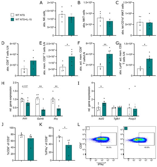 CD8+ T cells were found to be increased in the lymph node without reaching significance (Figure 3D). When characterizing them in-depth, we found a significant increase in CD44+ memory CD8+ T cells (Figure 3E). This increase was also seen in CD122+ activated memory CD8+ T cells (Figure 3F) and Ly49+ activated memory CD8+ T cells (Figure 3G). In the kidney, no difference in both CD8+ T cell subpopulations, but a trend toward more Ly49+ activated memory CD8+ T cells (p = 0.057, Figure S2A–C) was found. We sorted and cultured CD8+ lymphocytes from lymph nodes of mice subjected to 7 days of NTS treated with rIL-15 or vehicle (Figure S2D). Analysis of the gene expression profile after 4 days of culture with anti-CD3/anti-CD28 bead stimulation revealed that mice treated with rIL-15 showed a trend for lower Prf1 expression and significantly reduced expression of Gzmb and Ifnγ (Figure 3H). Additionally, expression of Ikzf2 in these cells increased, while there was no change in expression of Tgfb1 and Foxp3. (Figure 3I).