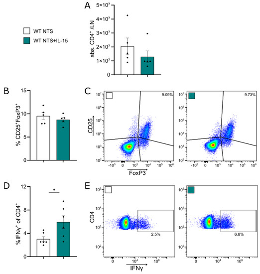 rIL-15 increases IFNγ production of CD4 T cells. Data represent day 7 of NTS. (A) Quantification of CD4+ T cells and (B) frequencies and (C) representative plots of CD25+Foxp3+ T cells in the lymph node. Flow cytometry analysis of frequencies of (D) IFNγ+ cells of CD4+ T cells and (E) representative plots of splenocytes after 4 days of culture. Data in D represent two independent experiments. Black dots represent individual values of respective mice. * p ≤ 0.05. Statistical analysis used was Student’s t-test or Mann–Whitney test. All data are mean ± SEM.