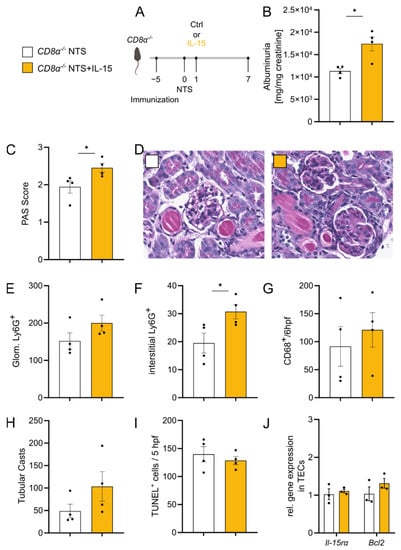 rIL-15 in NTS has no beneficial effect in CD8α−/− mice. (A) Experimental timeline of 7 days NTS in CD8α−/− mice with a single low-dose rIL-15 intervention. (B) Ratio of urinary albumin to creatinine. (C) Scoring of PAS-positive material and (D) representative staining in murine kidney tissue. (E) Immunohistochemical quantification of glomerular and (F) interstitial Ly6G+ cells and (G) renal CD68+ in 6hpf. (H) Quantification of tubular cast formation in PAS-staining of kidney tissue. (I) Quantification of TUNEL+ cells in 5 hpfs. (J) Relative gene expression of Il-15rα and Bcl2 in renal tubular epithelial cells. Black dots represent individual values of respective mice. * p ≤ 0.05. Statistical analysis used was Student’s t-test or Mann–Whitney test. All data are mean ± SEM.