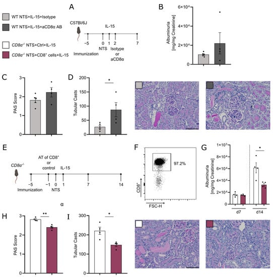 Adoptive transfer of CD8α+ cells into knockout mice and rIL-15 treatment reveal belated amelioration of NTS. (A) Timeline of the experimental setup of 7 days of NTS with low-dose rIL-15 intervention in both groups plus aCD8α antibody or isotype control antibody. (B) Urinary albumin to creatinine ratio, (C) PAS Score, and (D) tubular cast formation per 12 hpf in both groups and representative histological PAS stainings (×20 magnification, scale bar bottom right 100 µm). (E) Timeline of the experimental setup of 14 days of NTS in CD8α−/− mice. One group received 2.5 × 106 CD8α+ cells on day –1, and both groups were treated with low-dose rIL-15 on day 1 of NTS. (F) Dot plot of sorted and adoptively transferred CD8α+ cells showing 97.2% purity of cells. (G) Urinary albumin to creatinine ratio on days 7 and 14 of NTS, (H) PAS Score, and (I) tubular cast formation per 12hpf on day 14 of NTS and representative histological PAS stainings (×20 magnification, scale bar bottom right 100 µm). Black dots represent individual values of respective mice. * p ≤ 0.05, ** p ≤ 0.01. Statistical analysis used was Student’s t-test or Mann–Whitney test. All data are mean ± SEM.