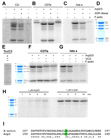 However, the precise pathogenic mechanisms of clostridial ADP-ribosylating toxins are still not completely understood. Therefore, we searched for additional substrate proteins of the bacterial ADP-ribosyltransferases. To this aim we analyzed ART-activity containing toxins including the C. difficile toxin CDT, C2I toxin from C. botulinum, and Iota toxin from C. perfringens for their ability to ADP-ribosylate the actin-related proteins of the Arp2/3 complex. The ubiquitous Arp2/3 complex consists of seven subunits, resides underneath the plasma membrane and is responsible for the stabilization of the cortical F-actin beneath the plasma membrane and its attachment to cell junctions. Furthermore, a number of stimulating signaling pathways converge on Arp2/3 complex, which subsequently regulates the formation of branched actin-filament networks within lamellipodia of migratory eukaryotic cells [12,13].