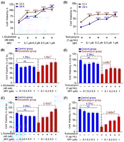SH-SY5Y cells were exposed to 40 mM of glutamate or 1 µg/mL of tunicamycin and simultaneously treated with different concentrations of NPY (0.1 µM, 0.2 µM, 0.5 µM, and 1 µM). In a control group, the cells were treated with the same concentrations of NPY alone to check the effects of the peptide on cell viability. Compared to control, cells exposed to glutamate showed a significant decrease in cell viability by 1.70 ± 0.04 and 2.06 ± 0.15 at 12 and 24 h (Figure 1B,C). Similarly, cells exposed to tunicamycin also showed a significant decrease in cell viability by 2.50 ± 0.12 and 4.37 ± 0.29 at 12 and 24 h (Figure 1E,F). Glutamate exposed cells which were treated with NPY showed a significant increase (p > 0.0001, Figure 1A) in the cell viability against the toxicity. A progressive increase in cell viability was observed with increasing concentrations of NPY, indicating the dose-dependent protective effects of the peptide. NPY treatment was found to exert its most significant protective effect at 1 µM concentration against glutamate toxicity at both the time points. NPY at 1 µM exhibited a significant increase in the cell viability by over 1.8 ± 0.17 and 2.4 ± 0.09 fold at 12 and 24 h, respectively (Figure 1B,C).