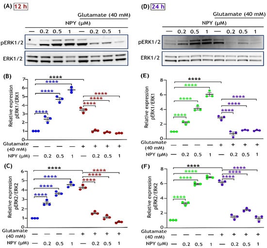 Dose-dependent inhibitory effects of Neuropeptide Y on glutamate-induced activation of ERK1/2 in SH-SY5Y cell cultures. Western immunoblot analysis illustrates the increased phosphorylation of ERK1/2 (T202/Y204) with NPY treatments in the absence of glutamate (control + NPY) at different concentrations, while NPY treatment reduced the glutamate-induced (glutamate + NPY) phosphorylation of ERK1/2 at 12 h treatment (A) and densitometric quantification of ERK1 (B) and ERK2 (C) blot densities indicate a significant increase in ERK1/2 phosphorylation under glutamate treatment compared to control (F(1,16) = 347.7 in Figure (B) and F(1,16) = 145.1 in Figure (C), **** p < 0.0001, n = 3) and this activation significantly decreased with increasing concentration of NPY treatment for 12 h (F(3,16) = 29.21 in Figure (B) and F(3,16) = 8.319 in Figure (C), **** p < 0.0001 represents significance between control and NPY group (blue), **** p < 0.0001 represents significance between glutamate and glutamate + NPY group (red), n = 3). Western immunoblot analysis for 24 h treatment (D) and their densitometric quantification of ERK1 (E) and ERK2 (F) blot densities indicates a significant increase in ERK1/2 phosphorylation under glutamate treatment compared to control (F(1,16) = 254.6 in Figure (E) and F(1,16) = 182.3 in Figure (F), **** p < 0.0001, n = 3) and a significant decrease in the glutamate induced phosphorylation of ERK1/2 with increasing concentration of NPY treatment (F(3,16) = 63.96 in Figure (E) and F(3,16) = 59.63 in Figure (F), **** p < 0.0001 represents significance between control and NPY group (green), **** p < 0.0001 represents significance between glutamate and glutamate + NPY group (purple), n = 3).
