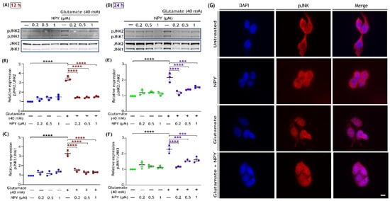 NPY treatment suppresses the activation of pro-apoptotic JNK induced by glutamate in SH-SY5Y cell cultures. Western blot analysis illustrates the glutamate induced phosphorylation of JNK (T183/Y185), while NPY treatments (glutamate + NPY) reduced the phosphorylation of JNK at 12 h (A) and densitometric quantification of JNK2 (B) and JNK1 (C) phosphorylation indicates a significant increase in phosphorylation of JNK induced by glutamate compared to control (F(1,16)= 102 in Figure (B) and F(1,16)= 67.85 in Figure (C), **** p < 0.0001, n = 3) and a concentration-dependent decrease with NPY treatments at 12 h (F(3,16) = 34.88 in Figure (B) and F(3,16) = 25.90 in Figure (C), **** p < 0.0001 represents significance between glutamate and glutamate + NPY group (red), n = 3). Western immunoblot analysis for 24 h treatment (D) and their densitometric quantification of JNK2 (E) and JNK1 (F) phosphorylation levels indicates a significant increase in phosphorylation of JNK induced by glutamate compared to control (F(1,16)= 59.13 in Figure (E) and F(1,16)= 64.77 in Figure (F), **** p < 0.0001, n = 3) and a concentration dependent decrease with NPY treatments (F(3,16) = 7.82 in Figure (E) and F(3,16) = 7.926 in Figure (F), *** p < 0.001 and **** p < 0.0001 represents significance between glutamate and glutamate + NPY group (purple), n = 3). (G) Immunofluorescence images (representative) of treated SH-SY5Y cells showing the expression of phosphorylated JNKs. After 12 h of treatment, cells were fixed and immunostained with an anti-phospho-JNK (T183/Y185) antibody (red). Nuclei were stained with DAPI (blue). Scale bar = 10 μm.