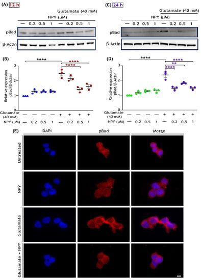 We next evaluated the phosphorylation of Bad at serine 128, which is dependent on JNK activation. Phosphorylation of Bad at serine 128 promotes the complex formation with anti-apoptotic Bcl-xL and thus promotes apoptotic pathways [,]. Western blot analysis of the cell lysates demonstrated marked upregulation of Bad phosphorylation (Ser 128) under glutamate toxicity conditions, and this upregulation was reduced with dose-dependent NPY treatments (Figure 4). Densitometric quantification demonstrated a significant increase in Bad (Ser 128) phosphorylation followed by its downregulated phosphorylation levels with NPY treatments in glutamate toxicity conditions (p < 0.0001; Figure 4B,D). However, no significant increase in phospho-Bad levels was observed in cells treated with NPY alone. We further investigated the treated cells by immunostaining with phospho-Bad (Ser 128) antibody. Similar to the western blot results, a decrease in pro-apoptotic activation of Bad was observed with NPY treatment in immunofluorescence staining of the cells (Figure 4E). These results indicate that the NPY treatment in SH-SY5Y cells induced anti-apoptotic effects through the downregulation of the ERK/JNK cascade as well as Bad phosphorylation in glutamate toxicity conditions.