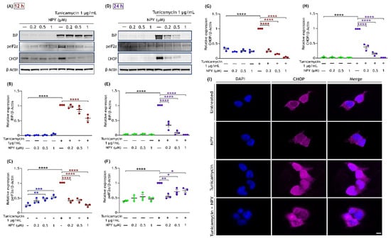 To further evaluate the protective action of NPY against tunicamycin-induced cell death, we examined the ER stress markers by Western blot analysis. Tunicamycin is a widely used pharmacological ER stress inducer that promotes ER-stress-mediated cell death over time [,]. BiP is a chaperone protein of the ER involved in the degradation of the unfolded proteins and is highly expressed under ER stress conditions []. We investigated the activation status of ER stress by analysing markers such as phospho-eIF2α, CHOP, and the expression of BiP in tunicamycin-exposed cells with or without NPY treatments. Western blot analysis revealed substantial increases in the upregulation of BiP, phospho-eIF2α (Ser 51), and CHOP expression caused by tunicamycin, and this upregulation was suppressed markedly with NPY presence at both 12 h and 24 h of treatment. The cells treated with NPY alone did not induce any noticeable changes in BiP and CHOP expression (Figure 5). Quantitative analysis of blot intensities showed that NPY treatment significantly suppressed the tunicamycin-induced upregulation of ER stress markers in a dose-dependent manner at both time points (p < 0.01, p < 0.0001; Figure 5A–H). The maximum effects of NPY against tunicamycin-induced BiP and CHOP expression were observed at 1 µM at both the time points (p < 0.0001; Figure 5B,E,G,H).
