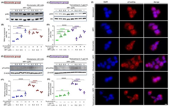 To ascertain the oxidative damage in cells by these insults, we further performed a Western blot and immunofluorescence analyses on the same cell conditions by probing with phospho-FoxO3a (Ser 253) antibody. Compared to the untreated cells, increased levels of FoxO3a phosphorylation were noticed in cells exposed to glutamate or tunicamycin (Figure 6E,G). Cells treated with NPY concentrations at 0.2 µM and 0.5 µM showed significant inhibition of FoxO3a phosphorylation under glutamate and tunicamycin stress (p < 0.0001; Figure 6F,H). However, a marked increase in FoxO3a phosphorylation was also observed in cells exposed to NPY concentration of 1 µM alone (p < 0.01, p < 0.001; Figure 6F,H). To access the localization of FoxO3a in response to insults and NPY treatment, we performed an immunofluorescence analysis. We found a higher FoxO3a localization in the subcellular region with insults (glutamate and tunicamycin), whereas, with NPY treatments, increased FoxO3a presence was observed within the nucleus (Figure 6I). On the other hand, at 24 h of treatment, there were no significant changes in Akt and FoxO3a activation. This indicates that the phosphorylation of these proteins was an acute response of cells against oxidative damage caused by glutamate toxicity or tunicamycin stress. These results suggest that NPY treatment decreases the oxidative damage caused by glutamate and tunicamycin in neuronal cells.