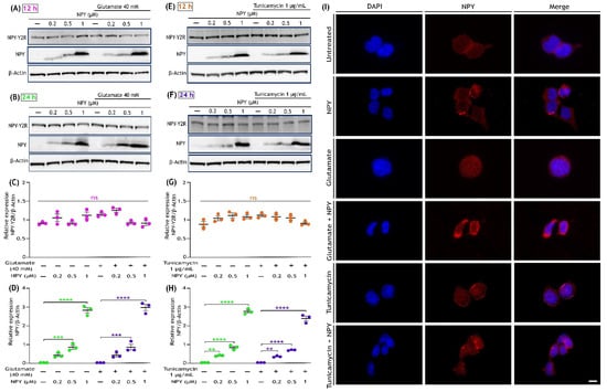 Among different types of NPY receptors, the neuroblastoma cell line SH-SY5Y was reported to selectively express the NPY-Y2 receptor (NPY-Y2R) [,,,]. The expression of NPY-Y2R and NPY were examined by Western blot and immunofluorescence analyses under glutamate toxicity, tunicamycin stress, and NPY treatment conditions. The Western blots analysis revealed that the expression of NPY-Y2R was not affected in SH-SY5Y cells either by the insults (glutamate and tunicamycin) or the NPY treatments (Figure 7A,B,E,F). Densitometric quantification of these blots revealed no significant changes in any of these groups (Figure 7C,G). Immunofluorescence analysis of NPY-Y2R expression also revealed no drastic differences in NPY-Y2R expression with treatments (Supplementary Figure S3). Further, the expression of NPY was found to be absent in untreated cells and cells exposed to glutamate or tunicamycin stress. On the other hand, NPY was found to be expressed in cells only treated with NPY or along with glutamate or tunicamycin stress (Figure 7A,B,E,F). Densitometric quantification of these blots indicated a dose-dependent significant increase in expression of NPY (0.2 µM, 0.5 µM, and 1 µM) in the NPY-treated cells (p < 0.01, p < 0.001, p < 0.0001; Figure 7D,H). Immunofluorescence staining with NPY antibody concurred with the immunoblot results showing higher expression in NPY-treated cells (Figure 7I). These results provide an understanding that the NPY-Y2Rs are well distributed in SH-SY5Y cell and are not affected by stress conditions. Additionally, untreated SH-SY5Y cell lacks or are deficient in NPY, and their presence inside the cell is proportional to the NPY treatment.