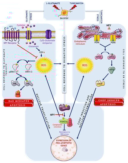 In conclusion, our findings highlighted that NPY attenuates the pro-apoptotic markers involved in glutamate toxicity, ER stress, and oxidative stress in SH-SY5Y cells (Figure 8) and strengthens further the concept of NPY as a potential therapeutic target against neurodegenerative diseases.