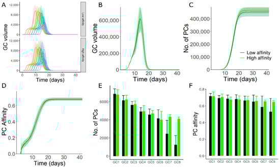 Simulation of late GCs with high affinity founder cells. (A) Volume kinetics of simulated GCs. GCs were initialized asynchronously and color code represents the timing of GC initiation. (B) Total volume of all GCs. (C) Plasma cell production from all GCs. (D) Affinity of plasma cells from all GCs. Readouts in B-D represent the sum of corresponding readouts of all simulated GCs weighted by the number of non-explicitly simulated GCs in each case. (E) Number of plasma cells produced from individual GCs. (F) Affinity of plasma cells from individual GCs. GCs 1–8 were sorted in the sequence of initiation. Inset in panel C applies for panels (B–F). In simulations labelled “Low affinity”, founder cells of GCs 1–8 were chosen randomly, and in “High affinity”, founder cells of GC7 and GC8 were chosen at a distance of 2 mutations from the optimal shape space position (3333). Strong GC–GC interaction strength (see methods) was considered in these simulations.
