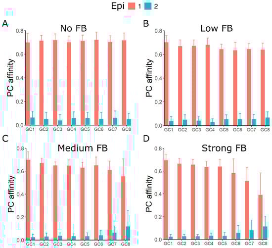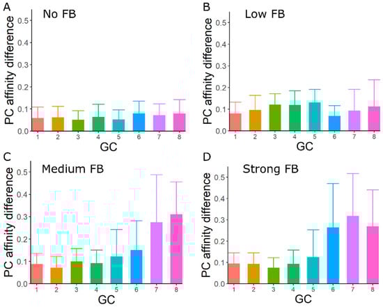 Differences in affinity maturation towards two different epitopes. (A–D) Differences in affinity of PCs between two epitopes for different strengths of GC–GC interactions (No FB, Low FB, Medium FB and Strong FB). The PC affinity difference was calculated as the absolute value of the difference between PC affinity to the two different epitopes. GCs were initialized asynchronously with two epitopes in equal proportion (shape space positions 3333 and 5555) and founder cell positions chosen randomly anywhere in the shape space. GCs 1–8 were sorted in the sequence of initiation.