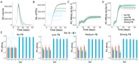 Interaction of GCs with different founder cell compositions. (A) Total volume of all GCs. (B) Plasma cell production from all GCs. (C) Affinity of plasma cells from all GCs to Epi 1. (D) Affinity of plasma cells from all GCs to Epi 2. Readouts in (A–D) represent the sum of corresponding readouts of all simulated GCs weighted by the number of non-explicitly simulated GCs in each case. (E) Affinity of plasma cells from individual GCs to different epitopes with different GC–GC interaction strengths (No FB, Low FB, Medium FB and Strong FB). GCs were simulated asynchronously initialized with two epitopes (shape space positions 2222 and 6666) in equal proportion. Founder cells of GCs 1–3 were chosen randomly anywhere in the shape space and founder cells of the rest of the GCs were chosen at a distance of 1 mutation from shape space position 6666. GCs 1–8 were sorted in the sequence of initiation.
