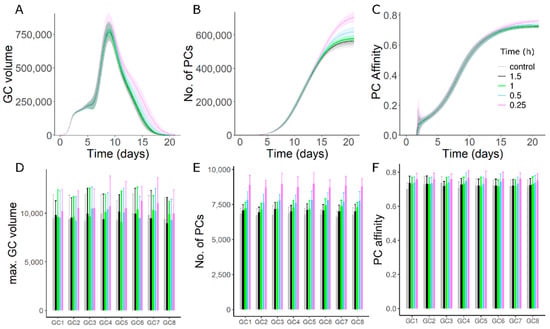 Firstly, we investigated whether GC–GC interactions inhibited only individual GC reactions or also the overall GC response. We simulated GCs that were initialized asynchronously (Figure 1B, see Section 2.2) with a single epitope (shape space position 3333, see methods) and founder cell positions randomly chosen anywhere in the shape space giving rise to a wide range of B cell affinities. Longevity of collective GC responses decreased earlier with increasing strength of GC–GC interactions (Figure 1C). In simulations without GC–GC interactions, a small decrease in the antigen resource on FDCs due to consumption by GC B cells impacts the average number of GC B cell divisions and promotes GC shutdown []. GC–GC interactions accelerate GC shutdown by reducing the antigen accessibility of B cells. Consequently, total number of plasma cells produced from the GC response was decreased (Figure 1D). Average affinity of plasma cells was also decreased due to the earlier termination of the affinity maturation process (Figure 1E), suggesting that the overall GC response was reduced. The inhibitory influence of soluble antibodies on the overall GC response was also found when the simulated GCs were initialized synchronously (Figure S1, see Section 2.2). This implies that the qualitative impact of GC–GC interactions on the overall GC response does not rely on the extent of synchronicity in GC initiation. A similar decrease in the longevity of GCs, quality and quantity of output were also seen in simulations with multiple epitopes (Figures S2 and S3). These results suggested that longevity and output of the overall GC response were limited by antibody-mediated GC–GC interactions.