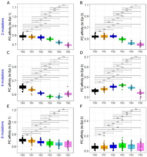 GC responses to antigenic variants. Affinity of plasma cells from all GCs to epitope 1 (A,C,E) and epitope 2 (B,D,F) at day 25 of the GC reaction. Mutation distance of epitope 2 with respect to epitope 1 is 2 (A,B), 4 (C,D) or 8 (E,F). Colors represent different GC–GC interaction strengths. FB0 represent simulations with no GC-GC interaction. FB1 and FB2 represent one-tenth and one-third of low interaction strength, respectively. FB3, FB4 and FB5 correspond to low, medium and strong interaction strengths, respectively. GCs were initialized with epitope 1 (shape space position 3333) and an antigenic variant (epitope 2) with mutation distance of 2, 4 or 8 (shape space positions 3344, 4444 and 5555, respectively) from epitope 1 was added from day 7 of GC reaction every 0.25 h. Founder cells of GCs were chosen randomly anywhere in the shape space. * = p < 0.05, ** = p < 0.01, *** = p < 0.001, **** = p < 0.0001, ns = not significant.