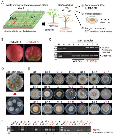 Assessment of ASSVd spread from apple trees to tree-associated fungi under natural conditions. (A) Experimental procedures carried out in this study. (1) After ASSVd symptom diagnosis and RT-PCR detection, apple trees were selected from three sites in one orchard under the same natural conditions. (2) Stem samples were collected from the selected viroid-infected or viroid-free apple plants, and plant-associated fungi were isolated from the samples and subjected to detection of ASSVd infection by RT-PCR. (3) Fungal amplicon sequencing was carried out to analyze the fungal communities present in ASSVd-infected and ASSVd-free apple stem tissues. (B) ASSVd induced disease symptoms in apple fruits harvested from the tested apple tree. (C) Detection of ASSVd in apple trees by RT-PCR. The host gene Apple ELONGATION FACTOR1a (MdEF-1a, DQ341381) was used as a control to verify the quality of the RNA. “M” indicates the DNA ladder, “+” indicates the positive control comprising a plasmid carrying an ASSVd cDNA fragment used as the PCR template, and “−” indicates the negative control without RT reaction. (D) The stem tissues were placed on PDA medium for fungal isolation. (E) The colony morphology of representative fungal isolates on PDA medium. (F) The detection of ASSVd by RT-PCR in the fungal isolates shown in (E).