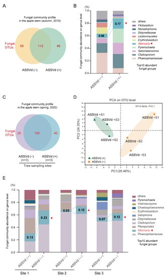 Fungal community profile in ASSVd-infected and ASSVd-free apple stem tissues. (A) Similarities and differences in fungal OTUs between two samples collected in the autumn of 2019 presented as a Venn diagram. (B) Composition of the fungal communities in the two samples collected in the autumn of 2019 classified at the genus level. The 10 most abundant fungal genera are presented. (C) Similarities and differences in fungal OTUs between two samples collected in the spring of 2020 presented as a Venn diagram. (D) Principal component analysis (PCA) of two samples collected in the spring of 2020 based on Bray–Curtis distances. (E) Composition of the fungal communities in the two samples collected in the spring of 2020 classified at the genus level. The 10 most abundant fungal genera are presented.