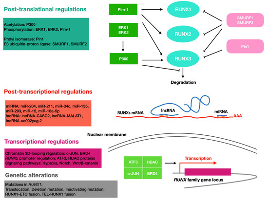Dysregulation of RUNX family proteins at different levels in cancer.