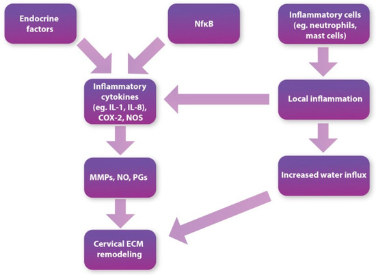 The presence of inflammatory cytokines can be seen in the cervix during its remodeling. The vast majority are proinflammatory cytokines such as IL-1, IL-6, IL-8, granulocyte colony-stimulating factor (G-CSF), TNF-α, and leukemia inhibitory factor (LIF) [21,39]. As mentioned above, cervical ripening resembles an inflammatory response in many aspects. This suggests that cytokines play one of the major roles in cervical remodeling and parturition.