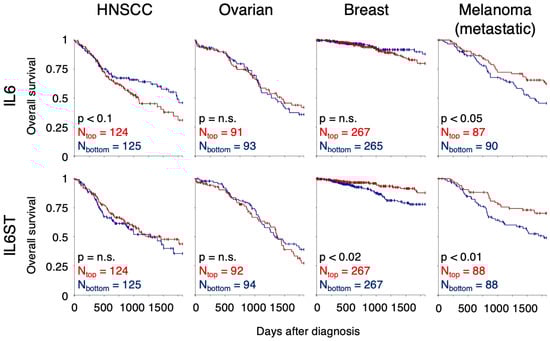 Correlation of patient survival with mRNA expression of IL-6 pathway components. Overall survival of patients suffering from HNSCC, ovarian cancer, breast cancer, or metastatic melanoma is evaluated for patients with different levels of IL6 mRNA expression (top) and IL6ST mRNA expression (bottom). Survival of the patients with the highest gene expression (4th quartile, Ntop patients) was compared with the survival of the patients with the lowest expression (1st quartile, Nbottom) using Kaplan–Meier curves and the log-rank test. The analysis was performed within the Xena platform [44].
