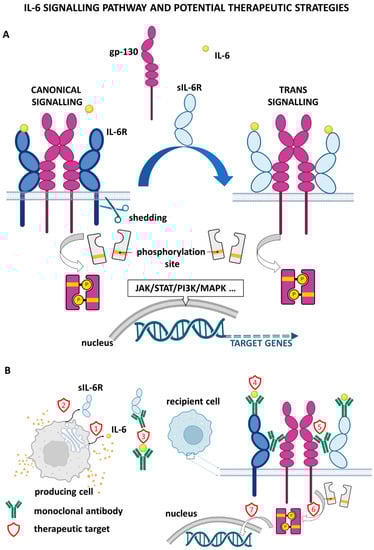 IL-6 signalling can follow either the classical or the trans-signalling pathway. Whereas the classical pathway is vital in the acute-phase immune response, regeneration, and haematopoiesis, the trans pathway allows cells not expressing the IL-6 receptor (IL-6R) to become responsive to this signal and initiate downstream signalling of IL-6 [3,10,11]. This allows such cells to engage in response to IL-6 stimuli and to become active participants rather than bystanders.