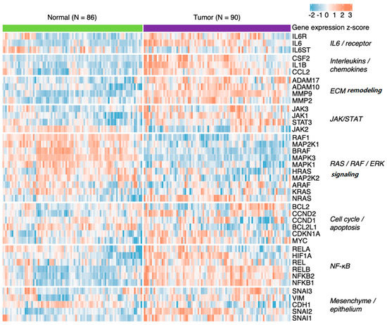 Deregulation of IL-6 signalling and its downstream targets in HNSCC tumours compared to matched samples of adjacent healthy mucosa (see Novotný et al., 2020 [141] for details).