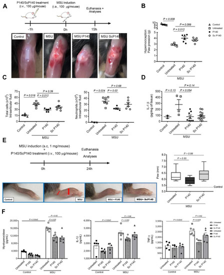 In the second set of experiments a single injection of MSU crystals (s.c. 3 mg) into the hind paw was performed. Mice received at the same time of MSU injection an injection intravenously of either the P140 peptide or the ScP140 used as the peptide control at a concentration of 100 μg/mouse/injection. After 24 h of MSU injection, mice were euthanized, and inflammatory parameters were evaluated.