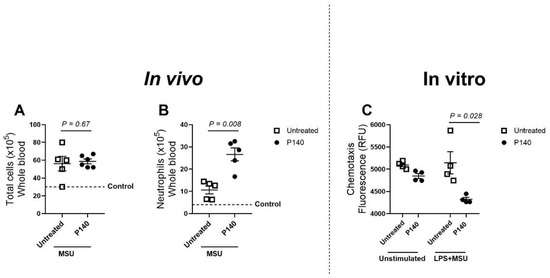 Next, we examined the effect of P140 on neutrophils in the blood. As shown in Figure 2, mice receiving an i.a. injection of MSU increased the number of both total cells and peripheral neutrophils compared to control mice not injected with MSU (Figure 2A,B, dashed line). However, it is noteworthy that P140 strongly raises the levels of neutrophils in the blood, as well as in the spleen (mean ± Standard Deviation (SD): PBS = 0.130 ± 0.06; MSU = 0.627 ± 0.06; P140 = 1.162 ± 0.935), of mice challenged with MSU compared to MSU-untreated mice (Figure 2B). These results combined with those shown in Figure 1C support the view that P140 might interfere with neutrophil influx to the site of inflammation. To confirm this possible effect of P140 on neutrophil migration, we conducted in vitro chemotaxis assay by using neutrophils isolated and purified from the blood donors and stimulated with MSU and LPS. In a statistically significant manner, P140 effectively decreased the CXCL8-induced migration of neutrophils in vitro (Figure 2C).