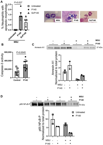 Accumulating data indicate that neutrophils are the most abundant cells among the leukocytes, which play a crucial role in the acute inflammatory response induced by MSU crystals [5]. After neutrophil mobilization from blood to the tissue releases several molecules with cytotoxic potential that contribute significantly to an extensive and inappropriate tissue injury [32]. The injection of MSU crystals triggers an inflammatory response with a significant accumulation of neutrophils in the joints with a peak between 12–15 h post-induction [4]. Using the protocol described above (P140 given 6 h after MSU injection with a sacrifice occurring 9 h later, thus maintaining the delay of 15 h after MSU induction), we observed increase apoptosis of neutrophils, which was not found when ScP140 was used as control peptide (Figure 4A). This effect of P140 on neutrophil survival was confirmed using isolated neutrophils from healthy human donors. Neutrophils stimulated with P140 increased caspase-3 activity (Figure 4B), associated with NF-κB inhibition on MSU-challenged cells (Figure 4C). Both effects observed on neutrophils are critical events for induction of neutrophil’s apoptosis, as already described previously [33]. Of note, apoptosis of neutrophils is an essential and safe event during the resolution of inflammation [34]. We further tested the effect of P140 on the expression of annexin A1, a glucocorticoid-regulated protein known to promote inflammation resolution by inducing neutrophil apoptosis [35]. When comparing MSU-stimulated neutrophils treated or not with P140, a clear trend towards a higher expression of annexin A1 was observed upon P140 treatment (Figure 4D). These results reinforce the hypothesis that in our experimental model of gout, the beneficial effect of P140 could, at least in part, results from its ability to decrease the lifespan of activated neutrophils, which are recognized contributors to synovitis, local joint destruction, and systemic inflammation in gout.