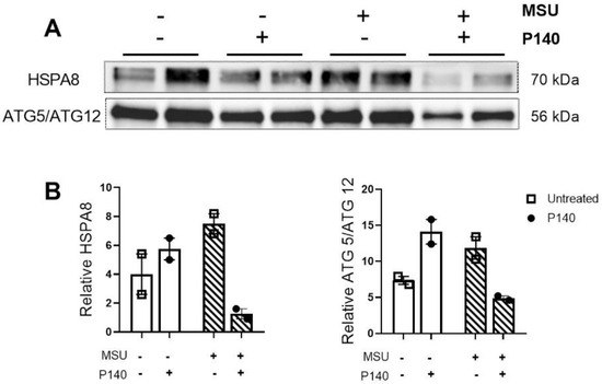 Consistent evidence indicates that P140 exerts its beneficial activity by modulating the abnormal autophagy process [19,20,36]. Autophagy is a tightly regulated mechanism that allows cells to self-renew by breaking down misfolded, overproduced, or damaged proteins. This process plays a crucial role in cellular homeostasis and immune responses [37,38]. In neutrophils, autophagy is essential for significant functions, including degranulation, reactive oxygen species production, and release of neutrophil extracellular traps (NETs) under stress and infection [39,40]. Previous studies have shown that P140 could correct dysfunctional chaperone-mediated autophagy (CMA) and macroautophagy in different in vitro and in vivo contexts [11,12,13,21,41], especially in vitro, in primary spleen cells of MRL/lpr lupus mice [19,20]. This prompted us to investigate the effect of P140 on autophagy in MSU-activated neutrophils (Figure 5; Supplementary Figure S2). These experiments led us to observe that in vitro human neutrophils treated with MSU seem to express higher levels of HSPA8 and covalent ATG5-ATG12 conjugate compared to neutrophils non-activated by MSU. Upon treatment with P140, the increased levels of expression of HSPA8 and ATG5-ATG12 conjugate return to basal levels (Figure 5A,B).