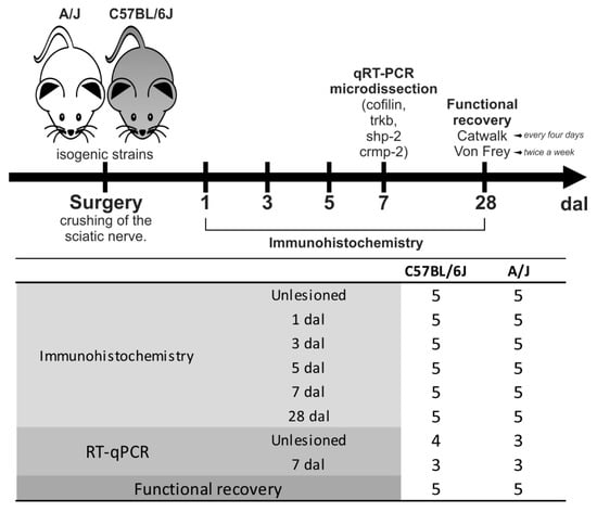Schematic drawing and detailed distribution of animals used for experimentation, ordered by strain, according to the technique applied. For immunohistochemistry and RT–qPCR, groups with different survival periods after sciatic nerve crush were analyzed. Uninjured animals were used as controls. Dal: days after lesion.